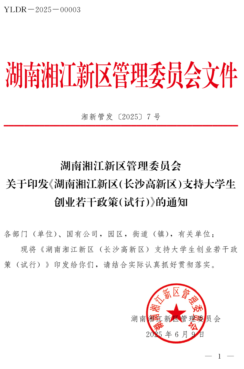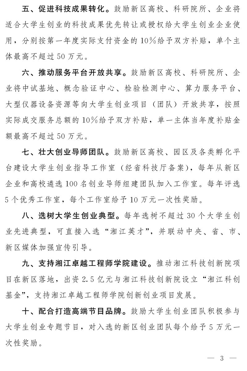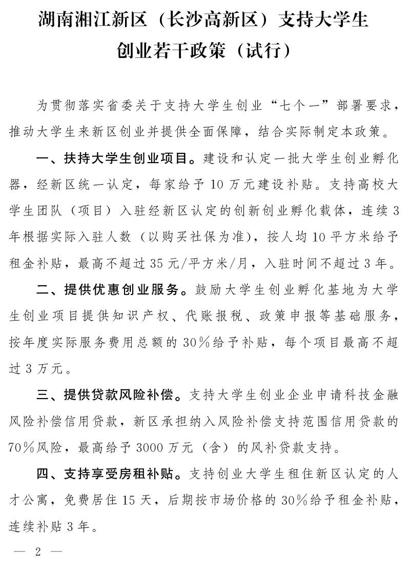 湖南湘江新区管理委员会 关于印发《湖南湘江新区(长沙高新区)支持大学生 创业若干政策(试行)》的通知