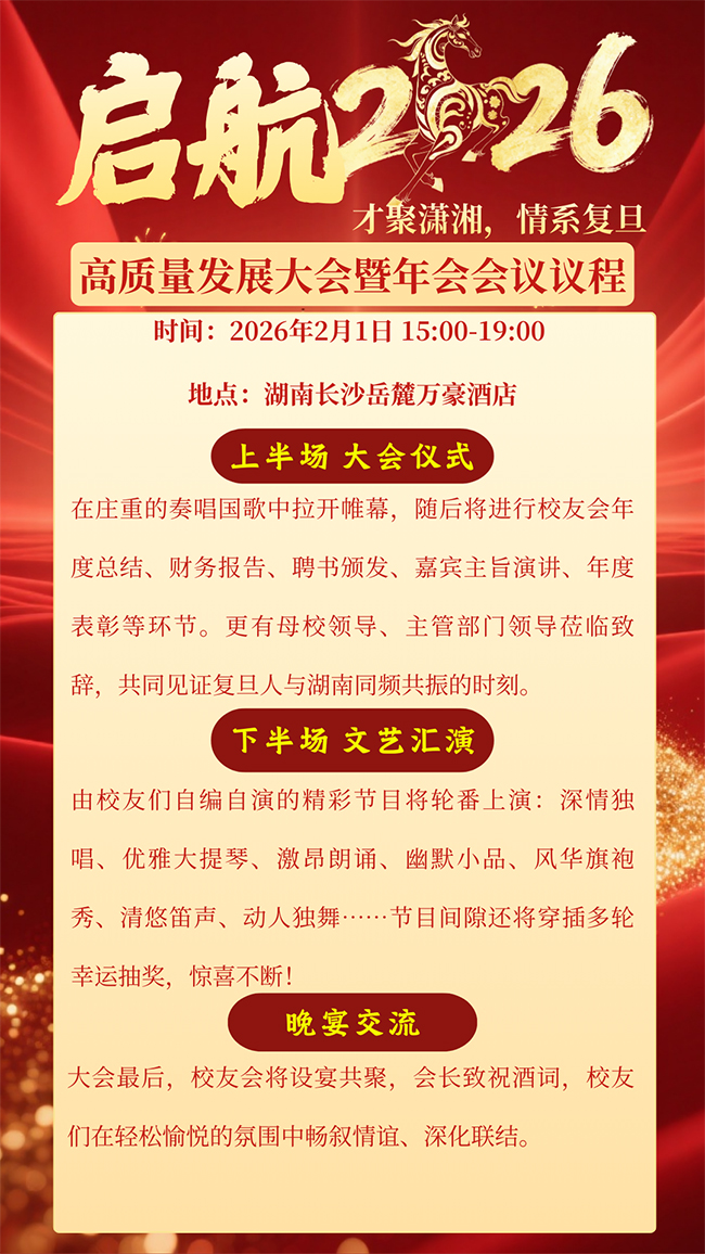 此次年会,我们期待所有在湘、关心湖南发展的复旦校友齐聚一堂,重温母校记忆,共话湘江未来。无论你是在湖南深耕多年,还是正计划归来,这里都有你的位置。