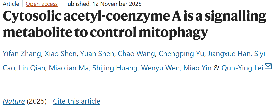 2025年11月12日,Nature在线发表了来自复旦大学生物医学研究院雷群英团队题为“Cytosolic acetyl-coenzyme A is a signalling metabolite to control mitophagy”的研究论文。该研究通过精巧的实验设计,发现并证实了线粒体自噬受体NLRX1可以感知细胞质内的乙酰辅酶A的动态变化,从而在营养匮乏或药物引起的代谢应激下调控线粒体自噬的启动。该发现不仅揭示了乙酰辅酶A不依赖乙酰化修饰和AMPK/mTOR信号通路的全新信号功能,突破了我们对代谢物功能的传统认知,还为克服KRAS抑制剂耐药性提供了全新的潜在靶点和联合治疗策略