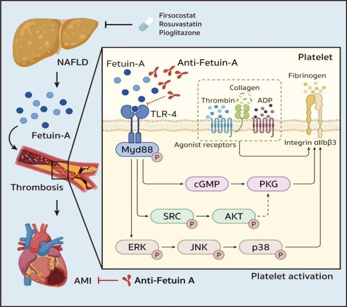 2025年6月20日,复旦大学附属中山医院葛均波院士团队在心血管病领域国际期刊Cardiovascular Research发表题为「Fetuin-A increases thrombosis risk in non-alcoholic fatty liver disease by binding to TLR-4 on platelets」的研究论文。该研究表明,NAFLD患者血浆中胎球蛋白A明显升高,通过作用于血小板TLR-4受体增加血小板反应性,提示降低胎球蛋白A或靶向胎球蛋白A-血小板TLR-4轴的治疗措施有望成为预防NAFLD相关动脉血栓事件的潜在策略。